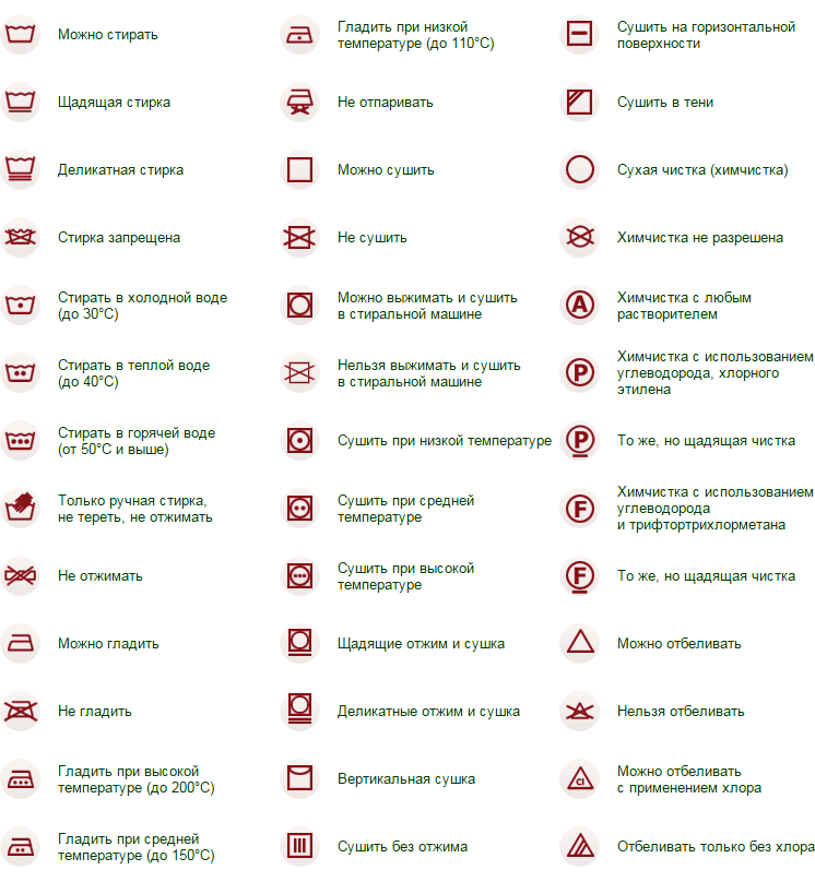 Эта информация помогает увеличить срок эксплуатации текстильных изделий, чтобы их внешний вид оставался безупречным, и при этом, чтобы были сохранены все эксплуатационные свойства. Разобраться в маркировке поможет таблица приведенная ниже: